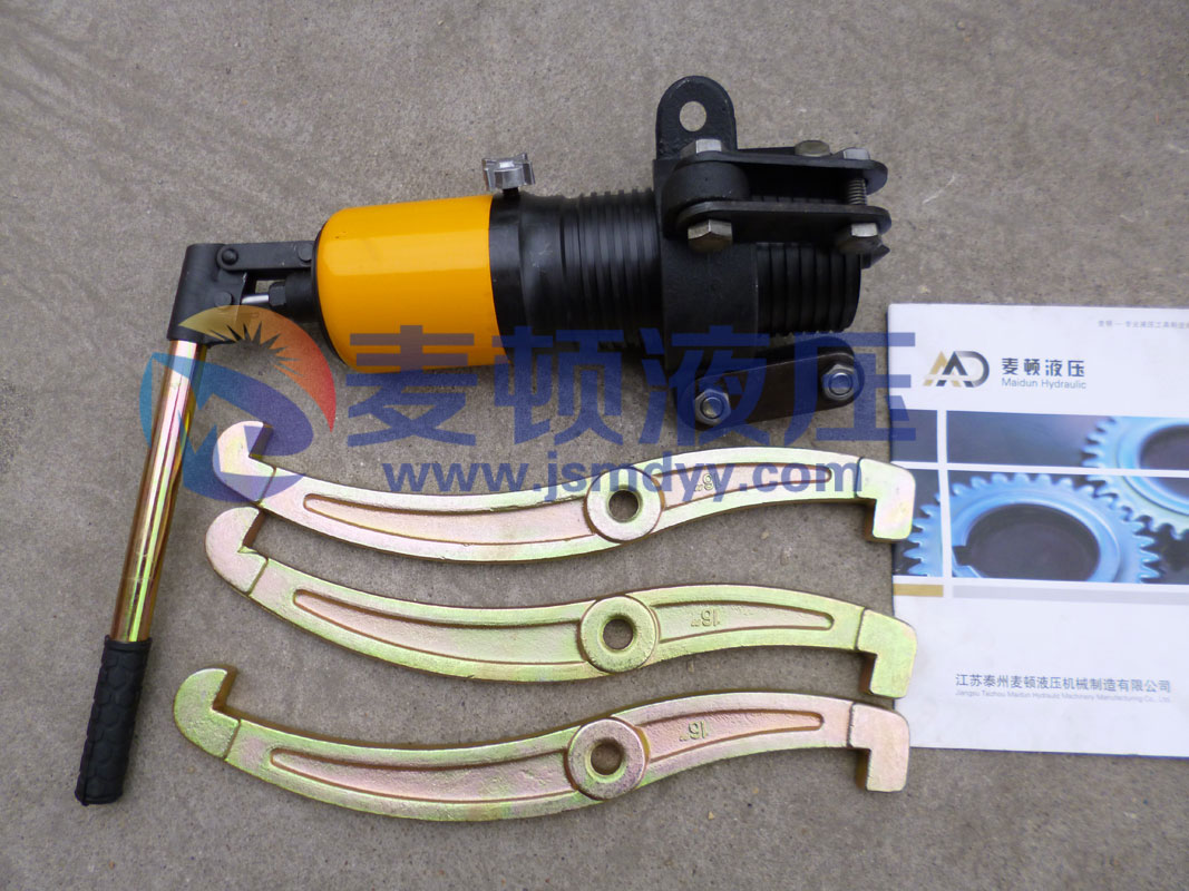 液壓拉馬是以液壓起動桿直接前進移動,故推動桿本身不作轉(zhuǎn)動。鉤爪座又可隨螺紋直接作前進后退之調(diào)距,操作時只要把手前后小幅度擺動,油壓起動桿前移,鉤爪相對應(yīng)后退,把被拉物體拉出。